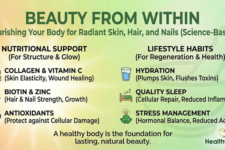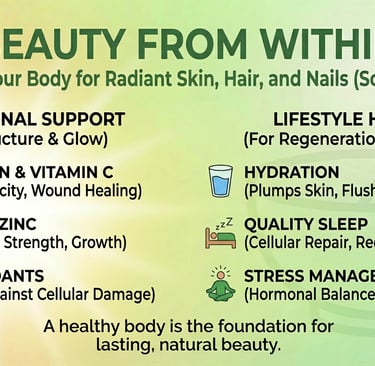 True beauty starts from within. The right foods and supplements nourish your skin from the inside, supporting hydration, glow, and healthy aging naturally.